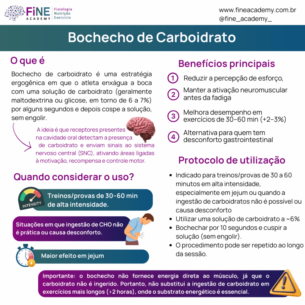 A partir de estudos pioneiros de Carter et al. (2004) e Chambers et al. (2009), observou-se que apenas enxaguar a boca com uma solução de carboidrato (sem engolir) foi suficiente para melhorar o desempenho em ciclismo e corrida.